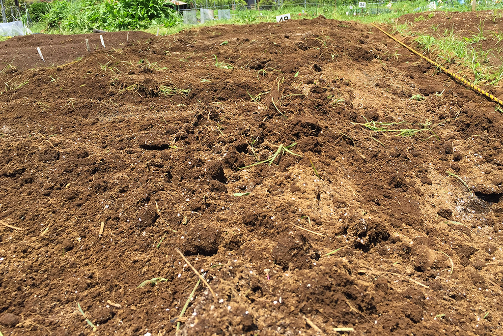 いちばん大変な作業、雑草を取りを終え、カキ殻と鶏糞、そして近所の牧場から安価で分けてもらった牛糞堆肥を土に混ぜ合わせました。
